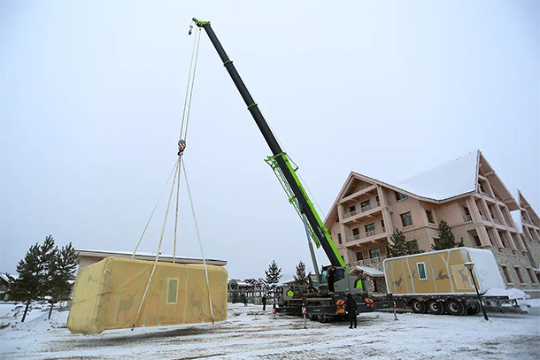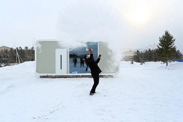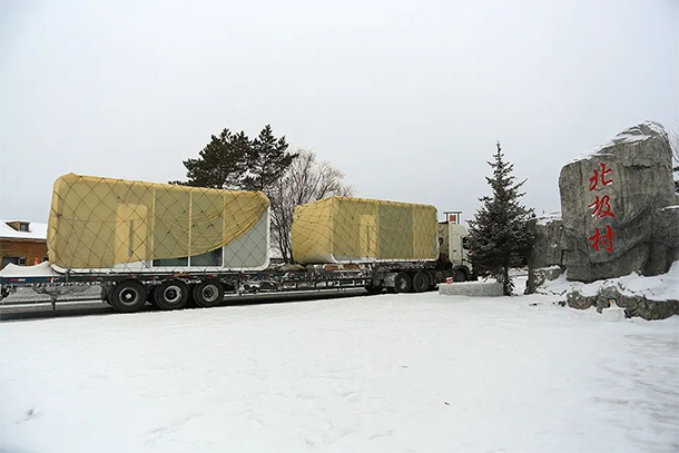 转眼间,两栋极具科技感的可移动现代旅居空间屹立于中国北境的冰封大地上,与北极村的皑皑白雪融为一体,日光映照,发出耀眼的光。