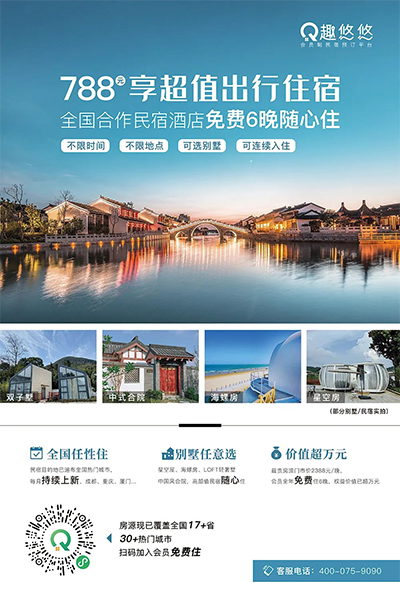在这一市场背景下,会员制民宿预订平台趣悠悠让高质低价的出游成为可能。用户只需付费788元成为会员,即可享受平台全国房源免费住6晚,不限节假日、不限房型、不限区域。趣悠悠会员制民宿预订产品既满足了当下“民宿热”的休闲度假需求,相比传统旅游预订平台又具有更大的价格优势,使其成为文化市集内最受关注的品牌之一。